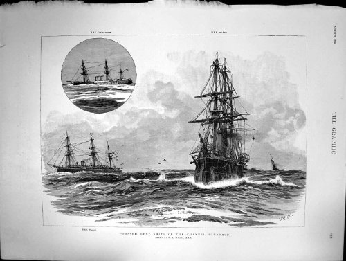 Old Original Antique Victorian Print 1890 Ships Channel Squadron H.M.S. Monarch Northumberland Wyllie 532J681