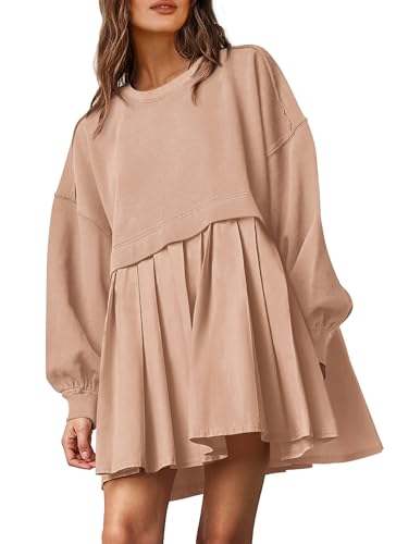 Prettygarden Women Pullover Sweatshirt Tops Long Sleeve Patchwork Loose Fit Pleated Mini Dress (Nude Pink Small)